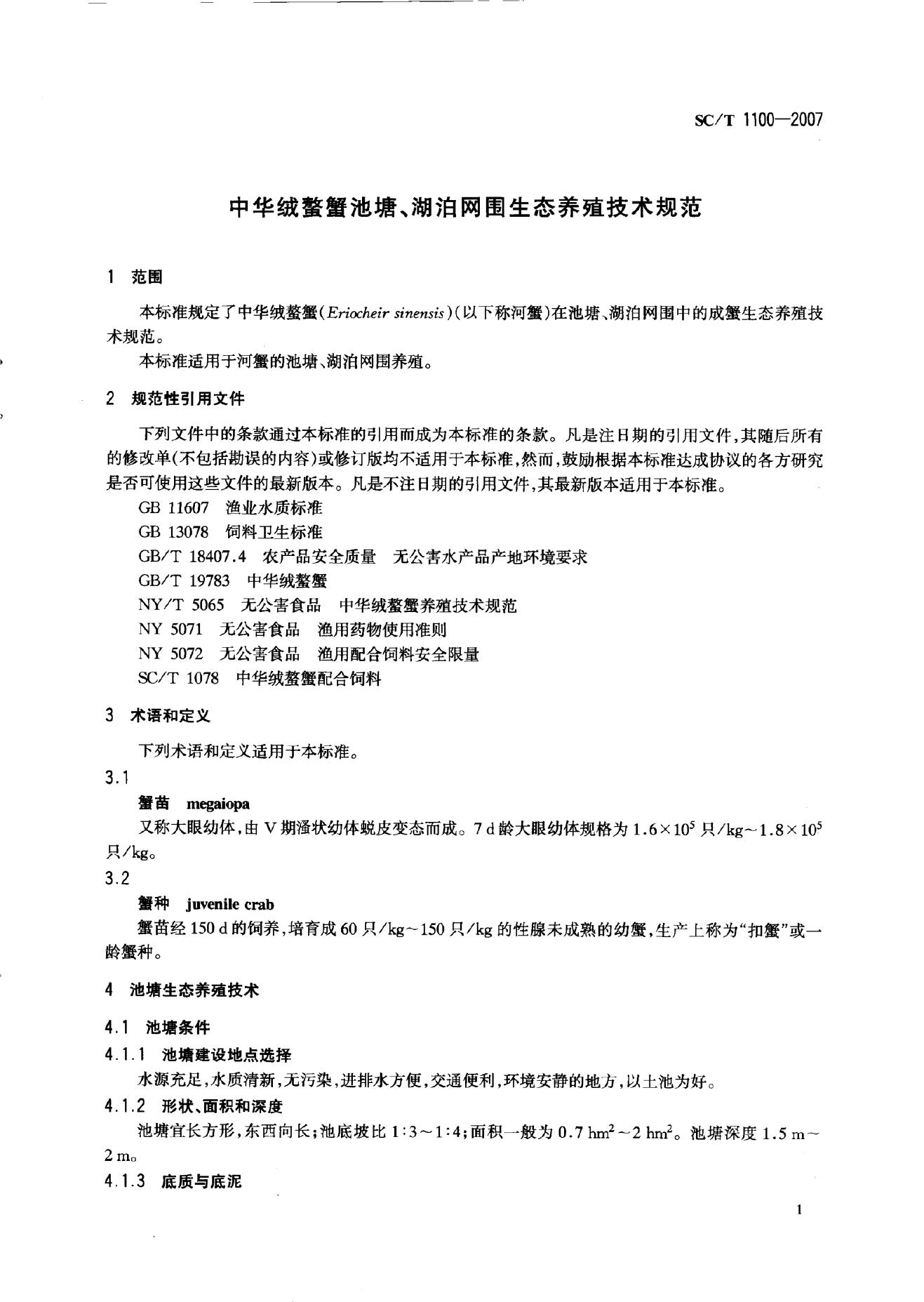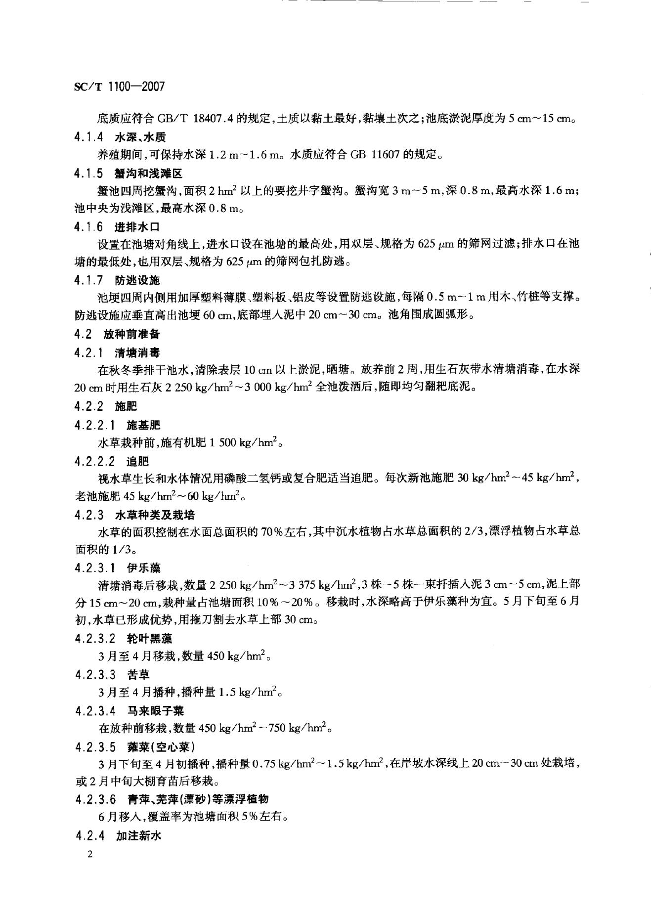 SC/T 1100-2007 中华绒螯蟹池塘、湖泊网围生态养殖技术规范