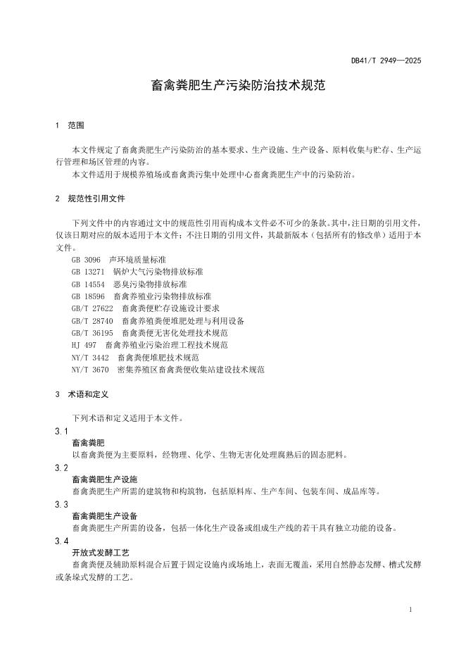 DB41/T 2949-2025 畜禽粪肥生产污染防治技术规范