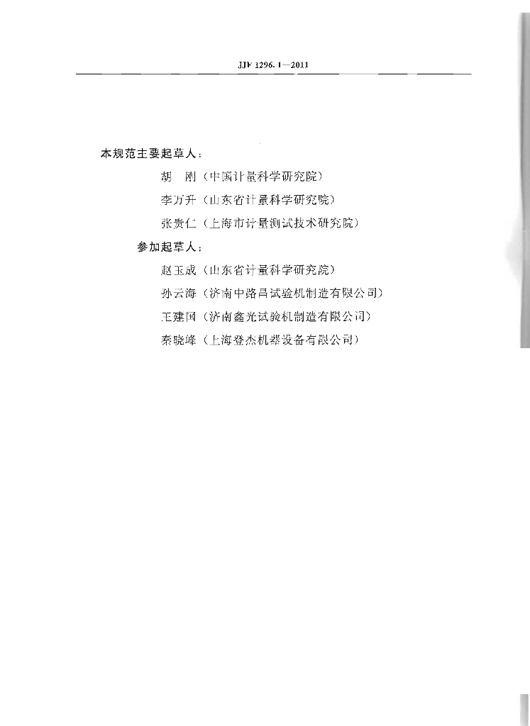 胡刚(中国计量科学研究院)、李万升(山东省计量科学研究院)、张贵仁(上海市计量测试技术研究院)、赵玉成(山东省计量科学研究院)、孙云海(济南中路昌试验机制造有限公司)、王建国(济南鑫光试验机制造有限公司)、秦晓峰(上海登杰机器设备有限公司)