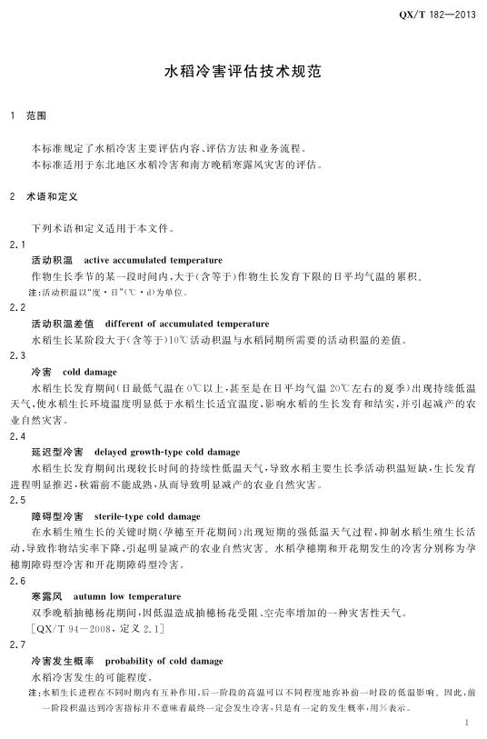 QX/T 182-2013 水稻冷害评估技术规范