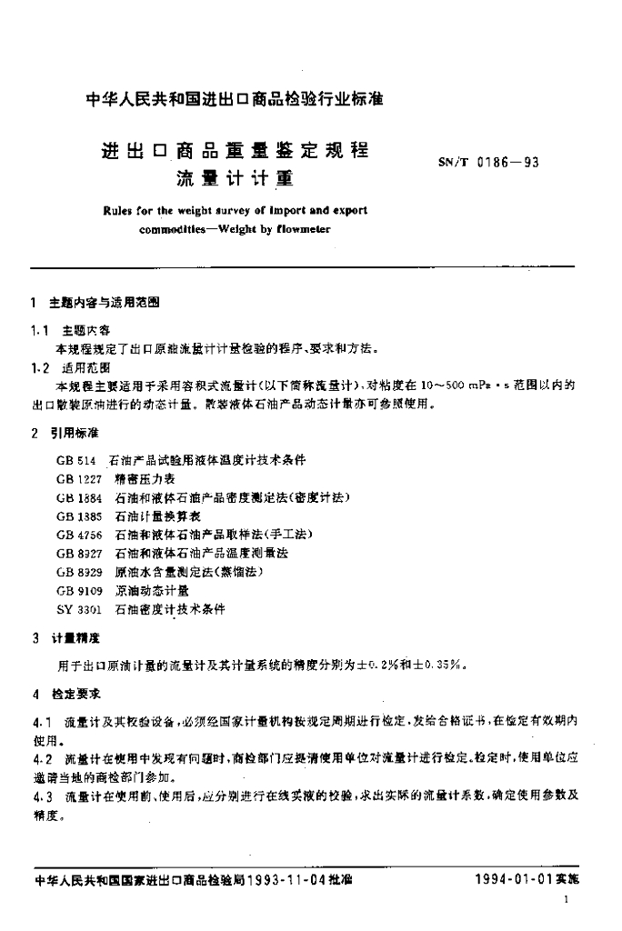 SN/T 0186-1993 进出口商品重量鉴定规程 流量计计重