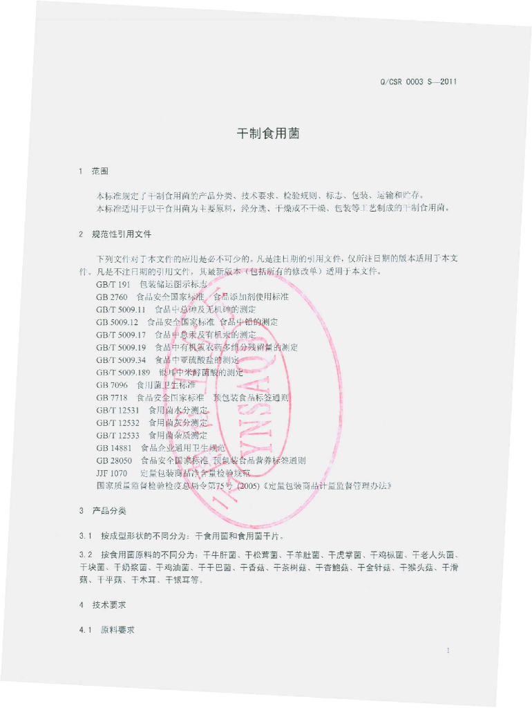 Q/CSR 0003S-2012 干制食用菌