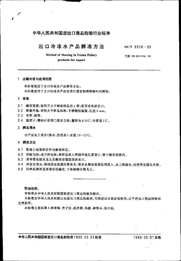 SN/T 0378-1995 出口冷冻水产品解冻方法