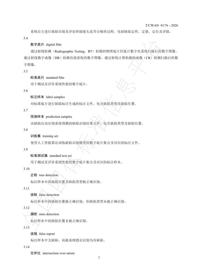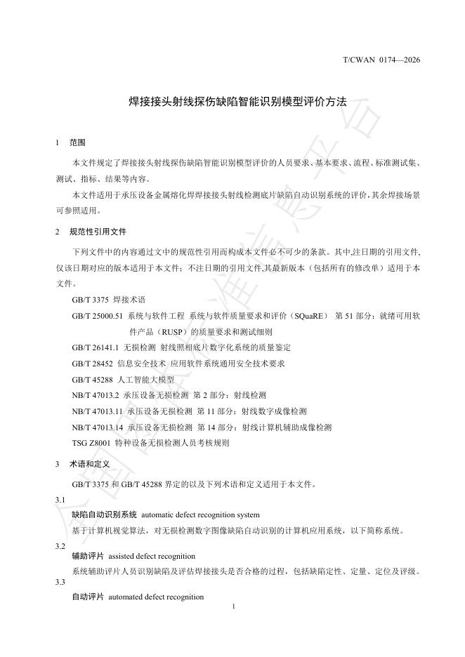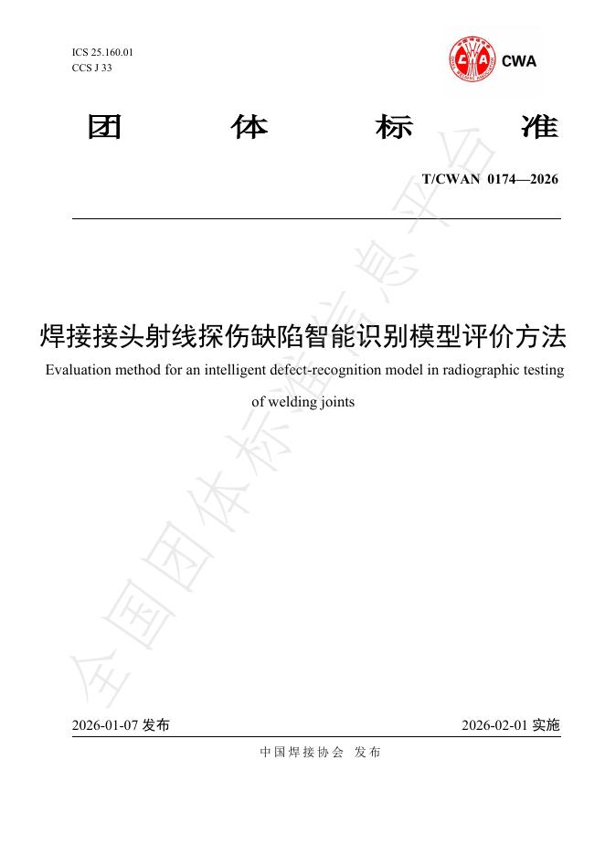 T/CWAN 0174-2026 焊接接头射线探伤缺陷智能识别模型评价方法