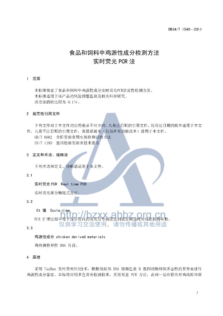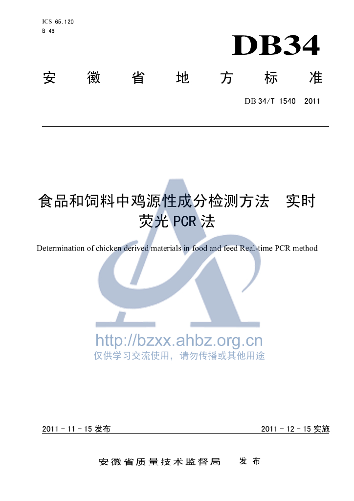 DB34/T 1540-2011 食品和饲料中鸡源性成分检测方法-实时荧光PCR法