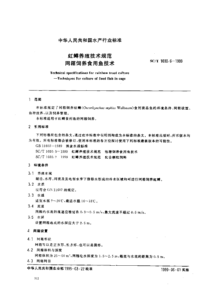 SC/T 1030.6-1999 虹鳟养殖技术规范 网箱饲养食用鱼技