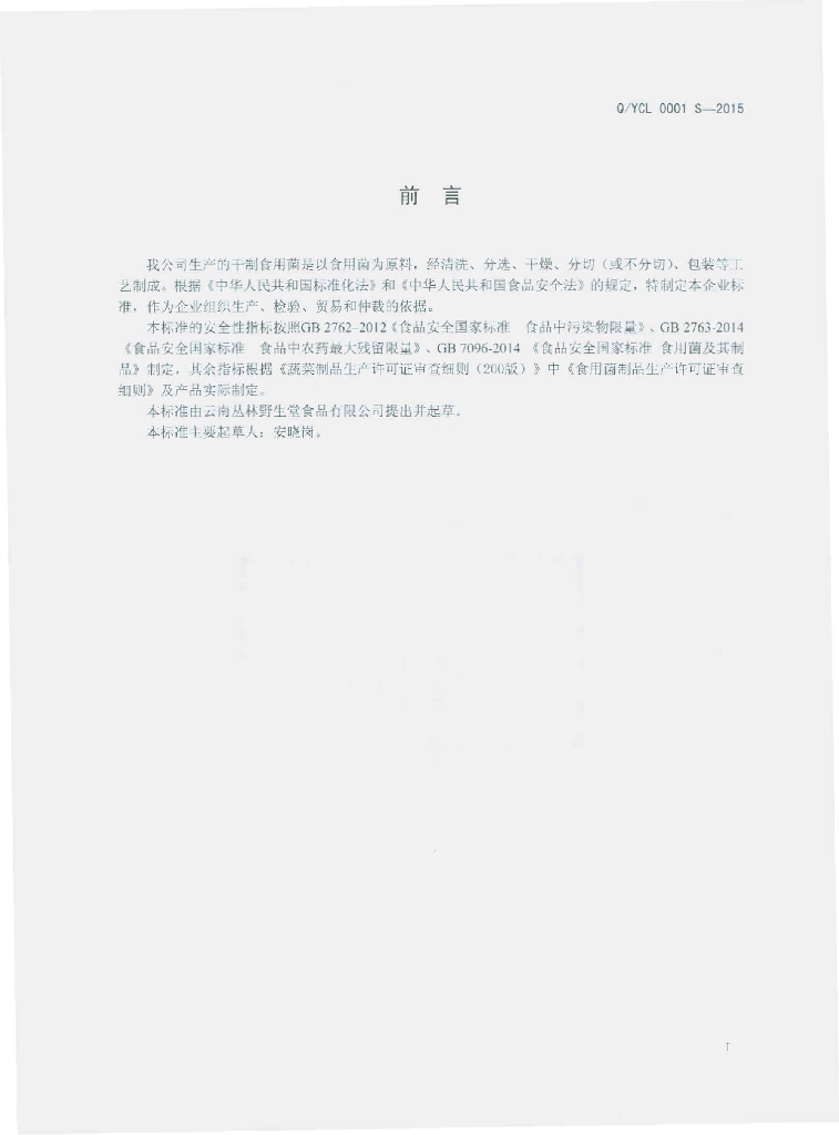 Q/YCL 0001S-2015 云南丛林野生堂食品有限公司 干制食用菌