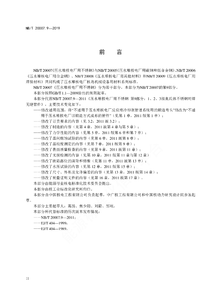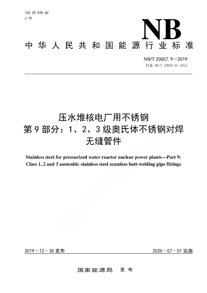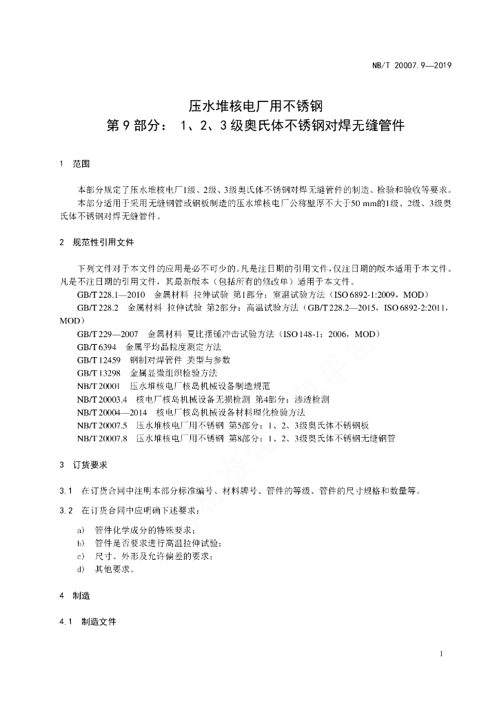 NB/T 20007.9-2019 压水堆核电厂用不锈钢 第9部分:1、2、3级奥氏体不锈钢对焊无缝管件