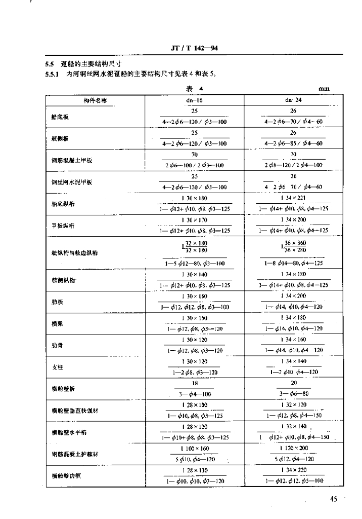 JT/T 142-1994 钢丝网水泥趸船主尺度和结构尺寸