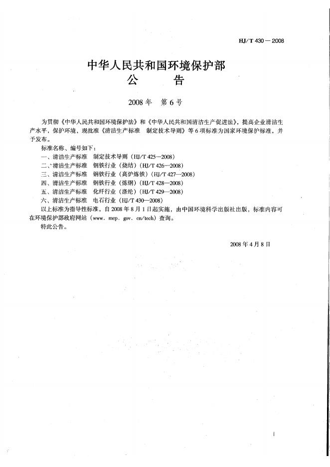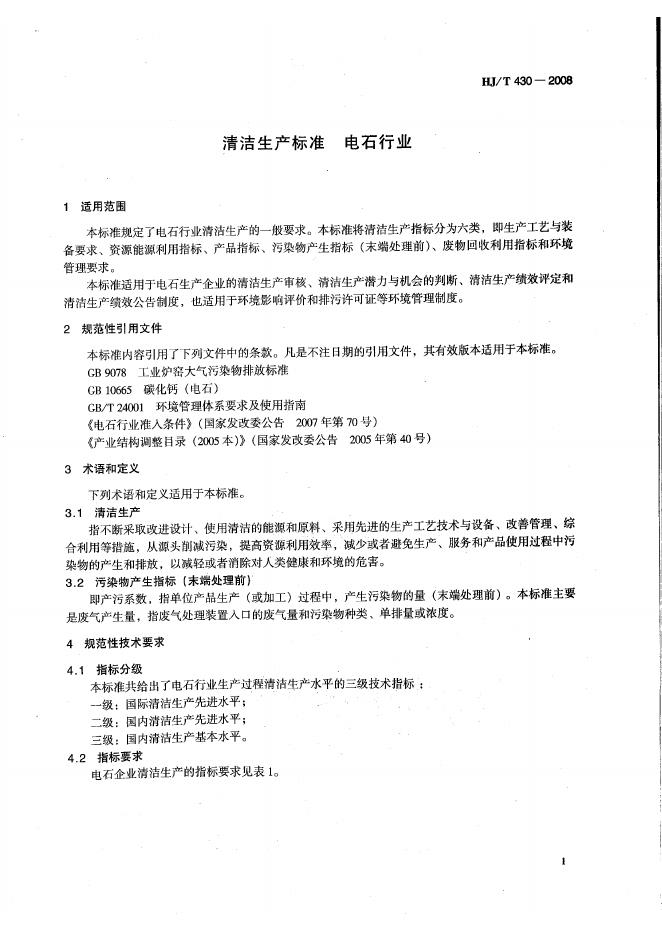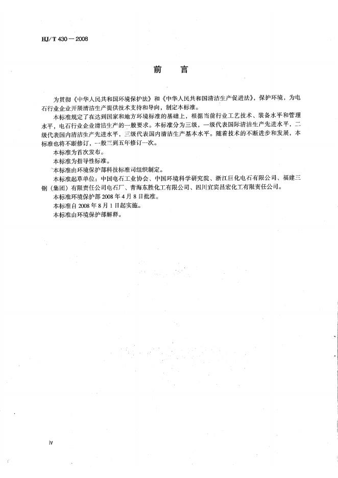 HJ/T 430-2008 清洁生产标准 电石行业