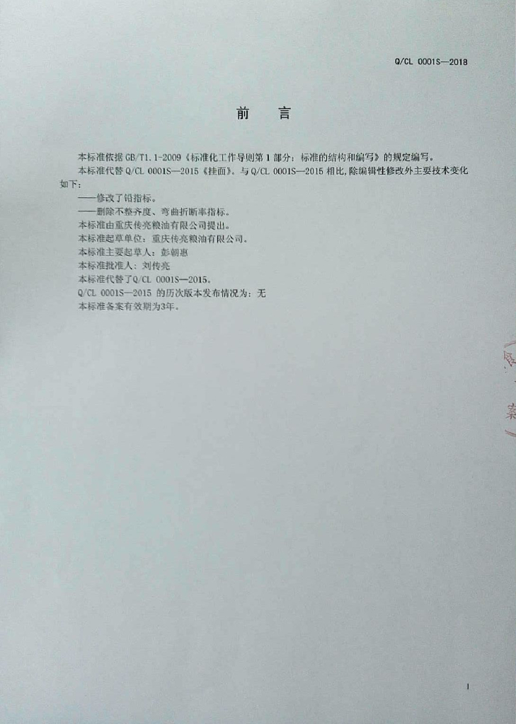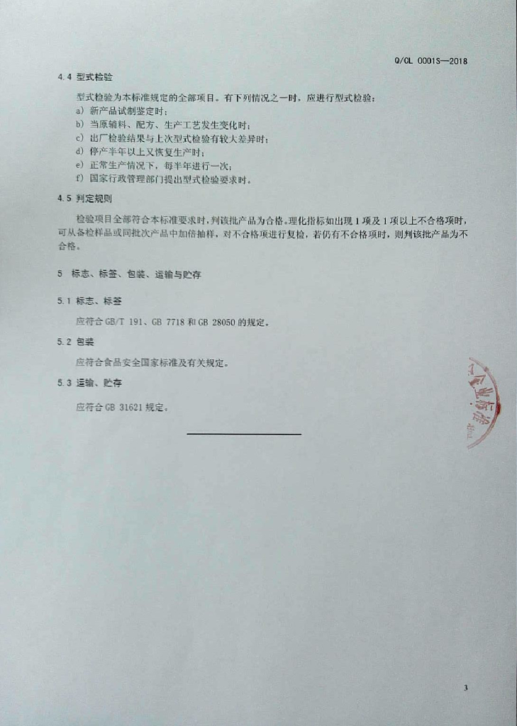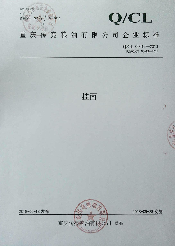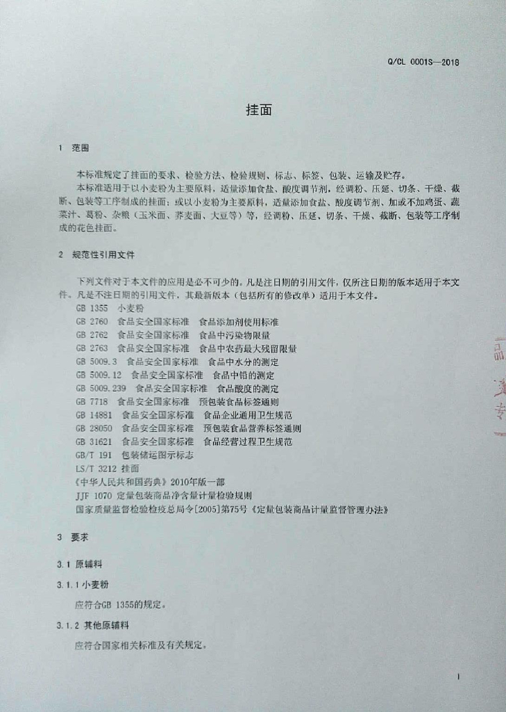 Q/CL 0001S-2018 挂面