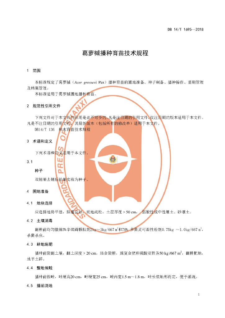 DB14/T 1695-2018 葛萝槭播种育苗技术规程