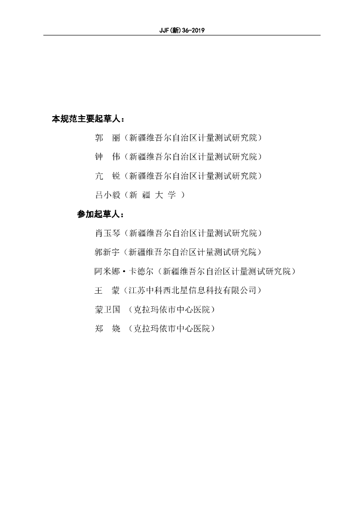 郭丽(新疆维吾尔自治区计量测试研究院)、钟伟(新疆维吾尔自治区计量测试研究院)、亢锐(新疆维吾尔自治区计量测试研究院)、吕小毅(新疆大学)、肖玉琴(新疆维吾尔自治区计量测试研究院)、郭新宇(新疆维吾尔自治区计量测试研究院)、阿米娜·卡德尔(新疆维吾尔自治区计量测试研究院)、王蒙(江苏中科西北星信息科技有限公司)、蒙卫国(克拉玛依市中心医院)、郑娆(克拉玛依市中心医院)