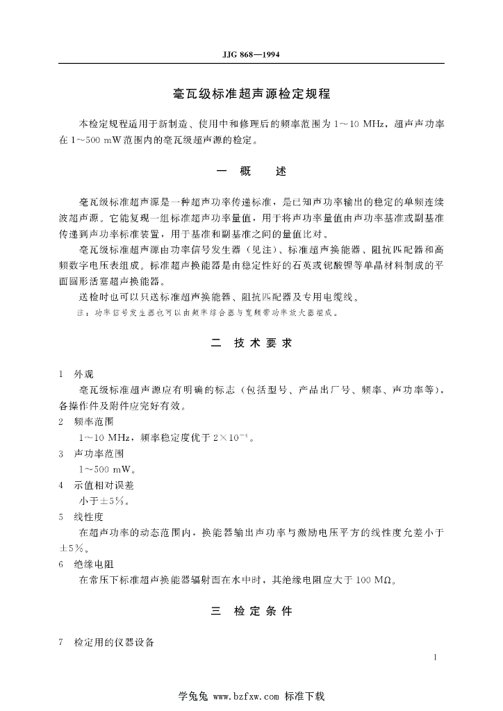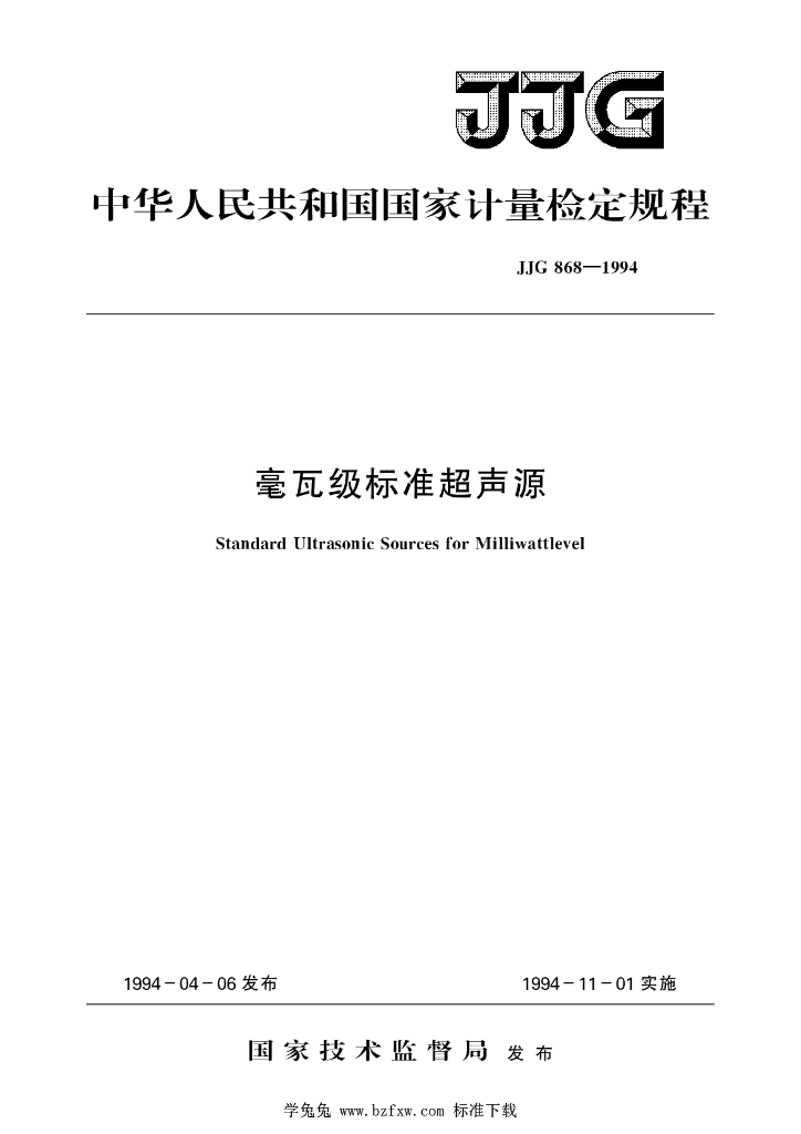 JJG 868-1994 毫瓦级标准超声源