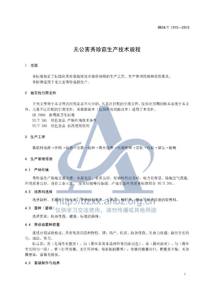 DB34/T 1215-2010 无公害秀珍菇生产技术规程