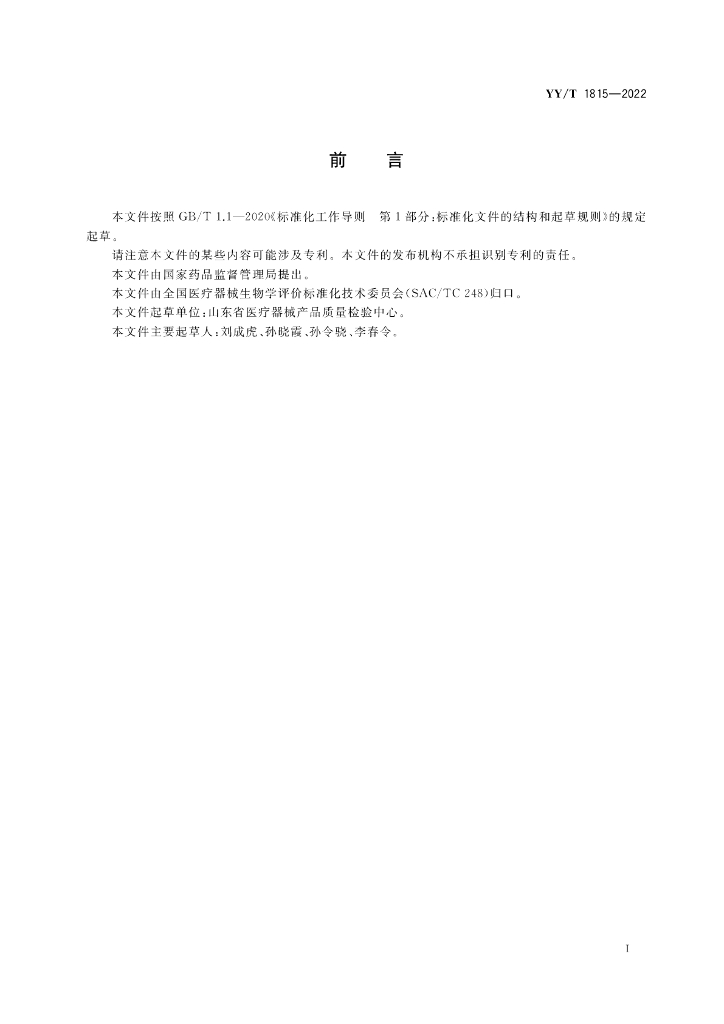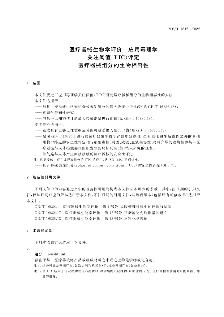 YY/T 1815-2022 医疗器械生物学评价 应用毒理学关注阈值(TTC)评定医疗器械组分的生物相容性