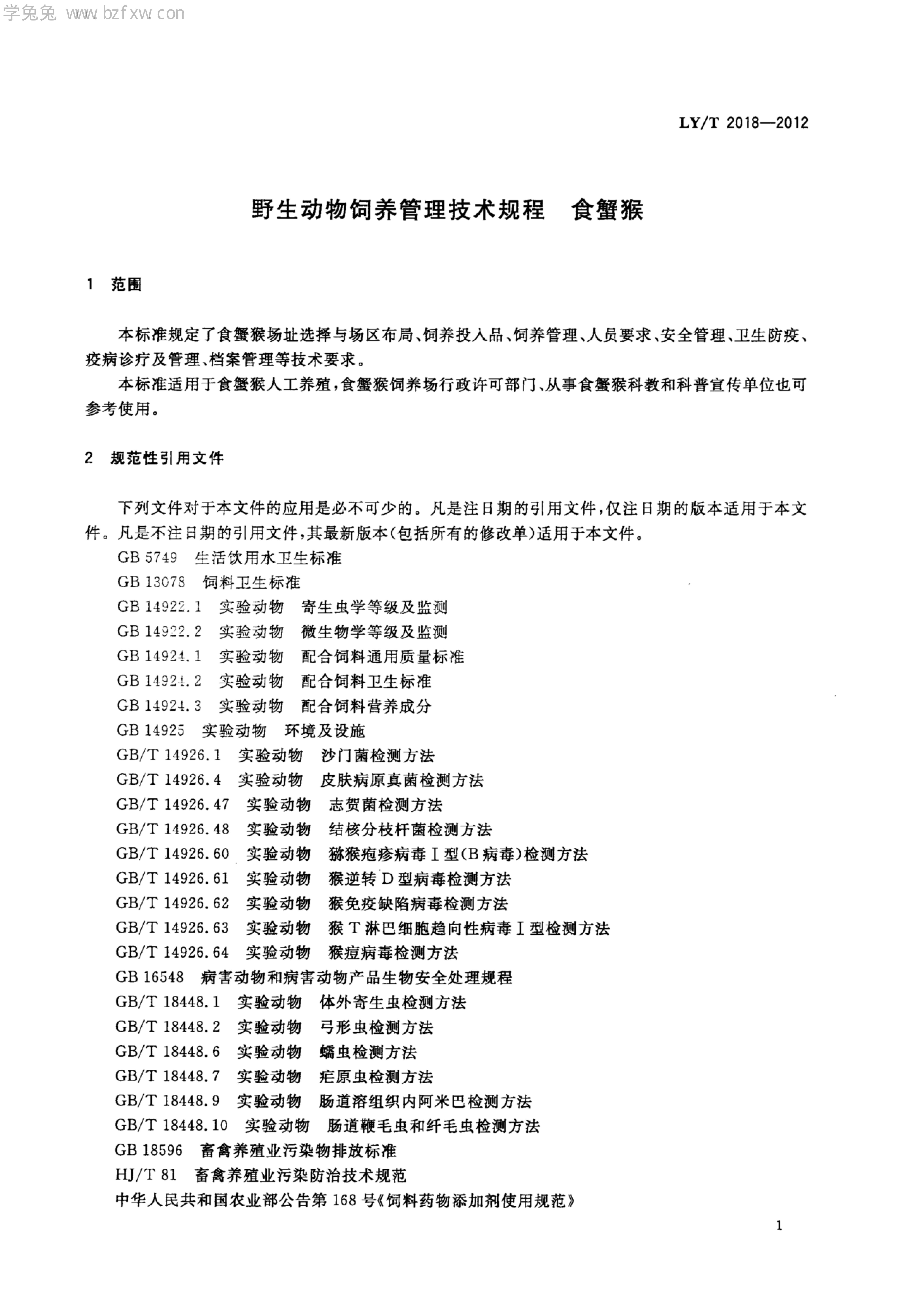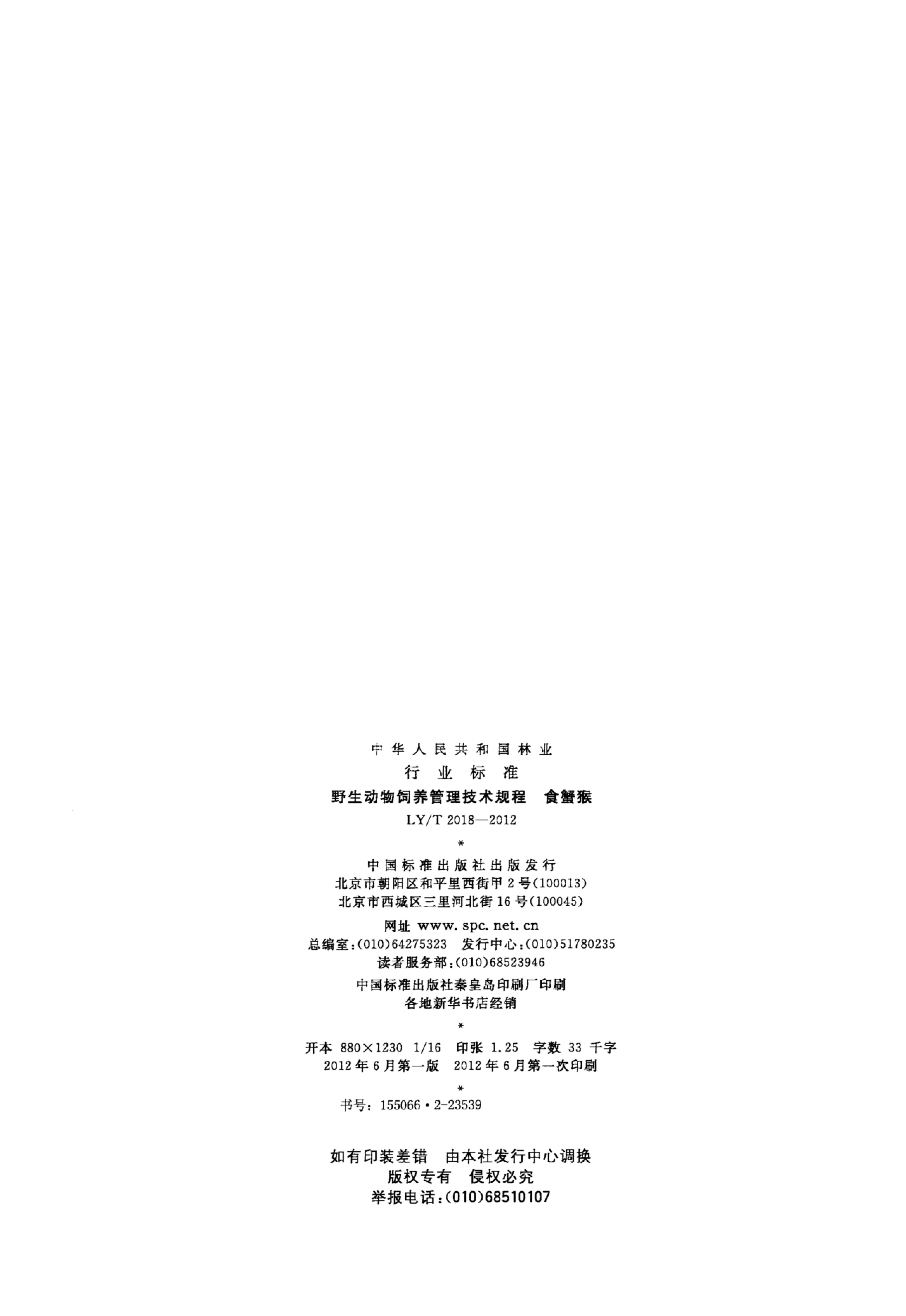 LY/T 2018-2012 野生动物饲养管理技术规程 食蟹猴