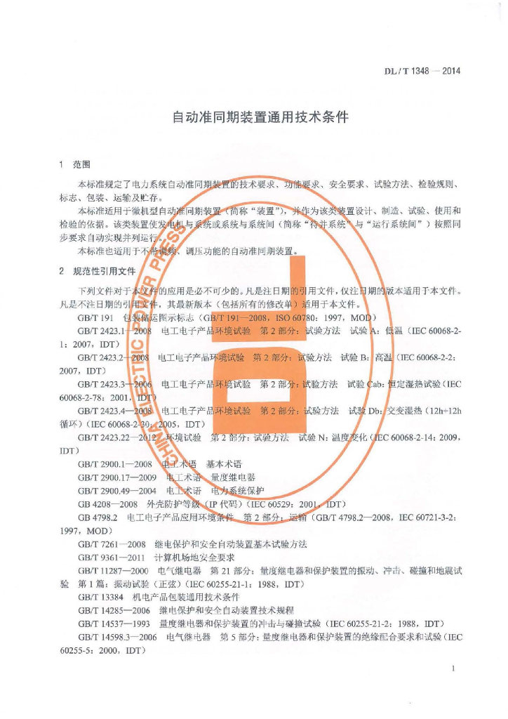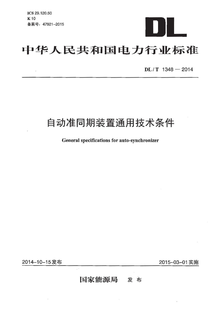 DL/T 1348-2014 自动准同期装置通用技术条件