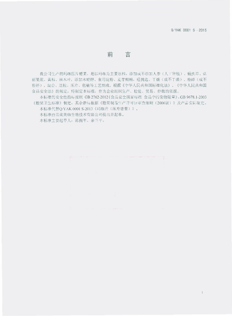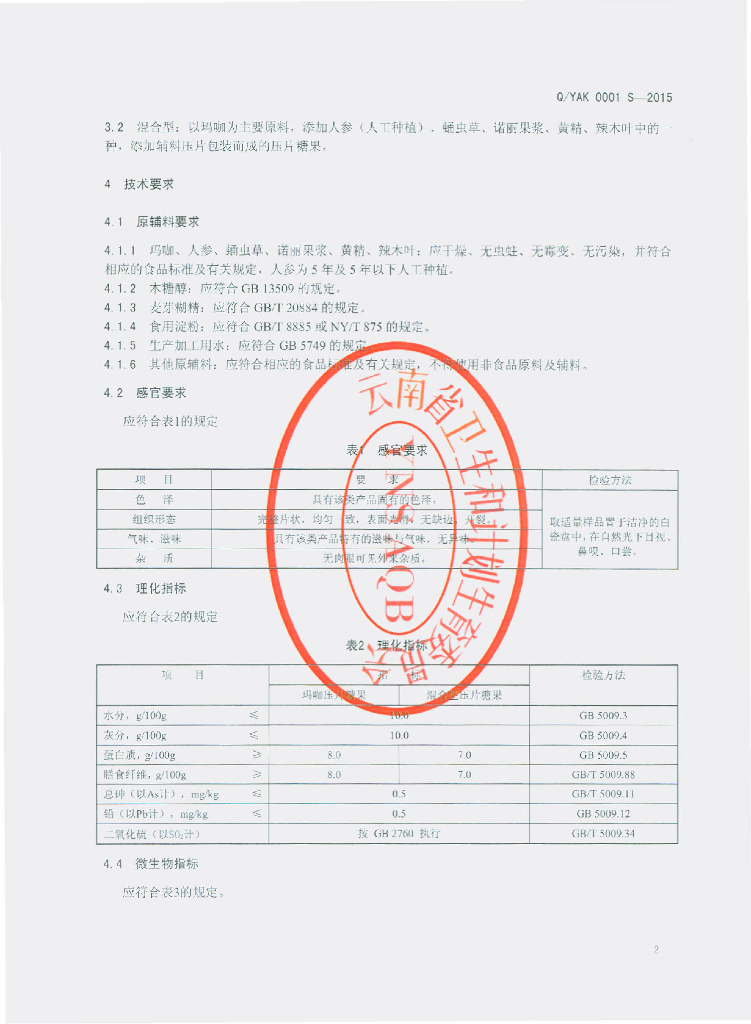 Q/YAK 0001S-2015 云南奥咖生物技术有限公司 玛咖压片糖果