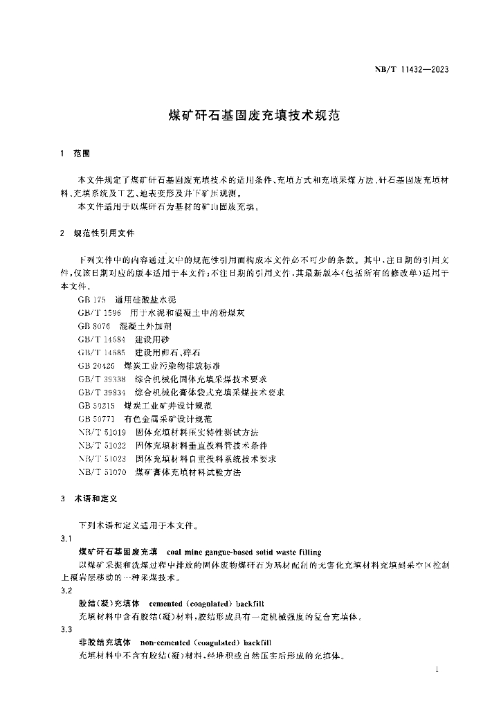 NB/T 11432-2023 煤矿矸石基固废充填技术规范