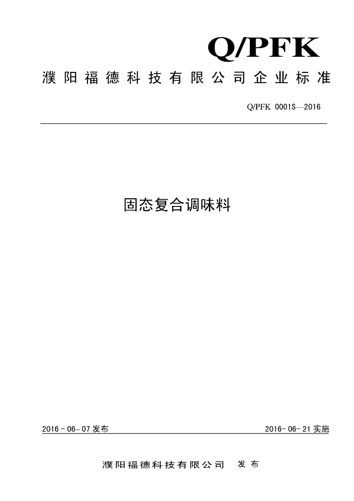 Q/PFK 0001S-2016 濮阳福德科技有限公司 固态复合调味料