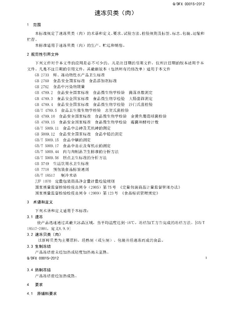 Q/DFX 0001S-2012 速冻贝类(肉)