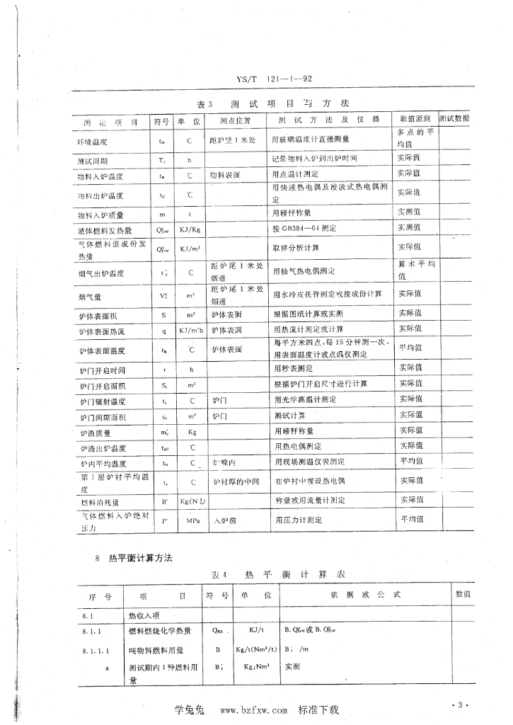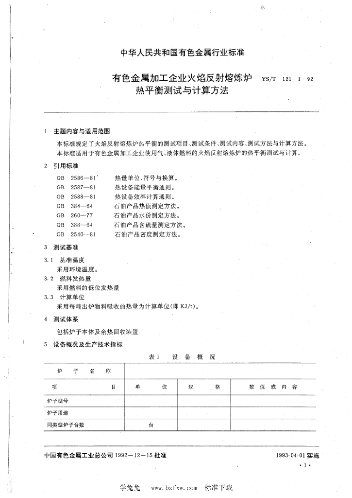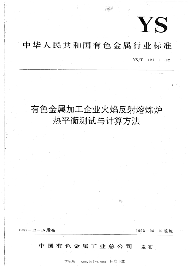 YS/T 121.1-1992 有色金属加工企业火焰反射熔炼炉热平衡测试与计算方法