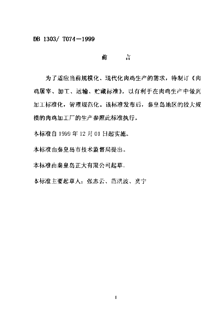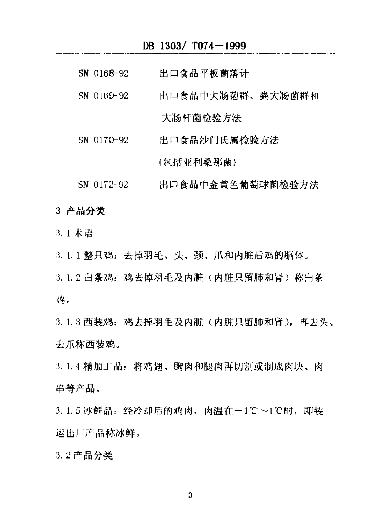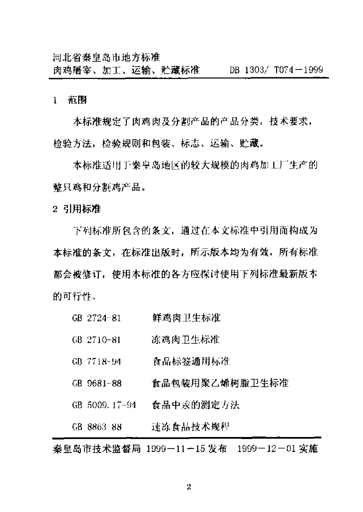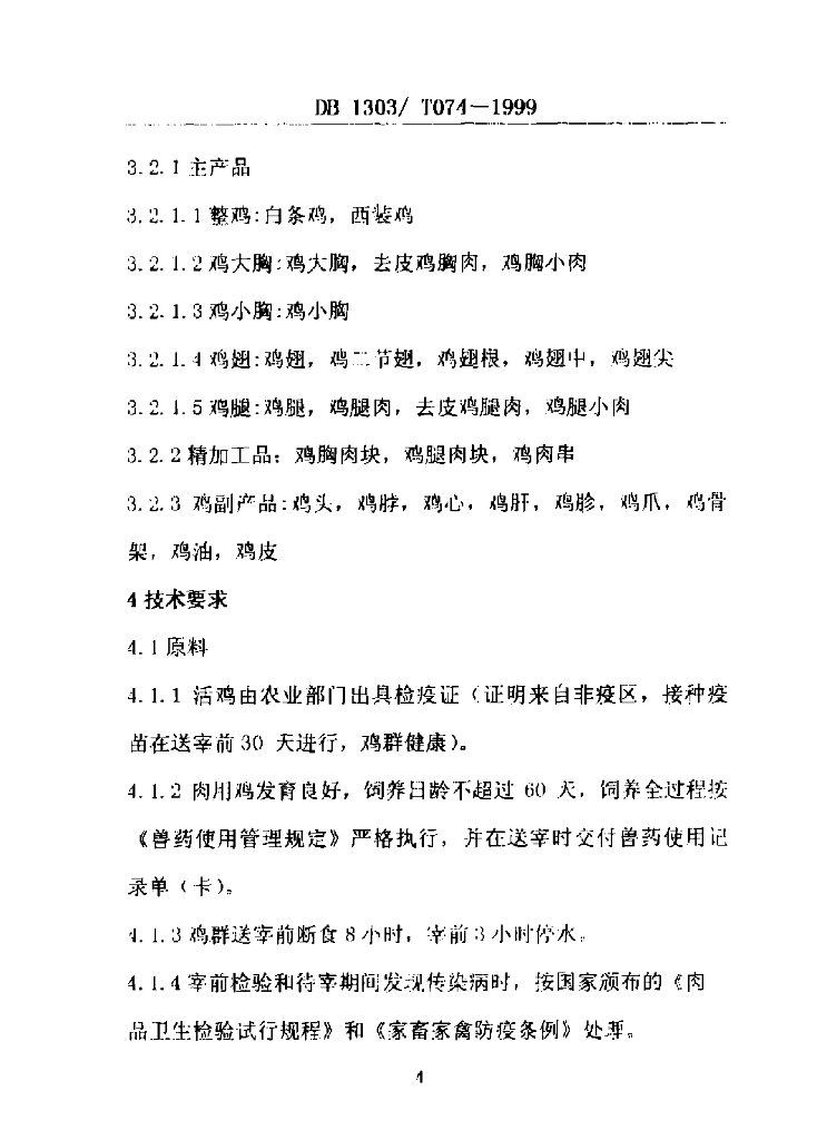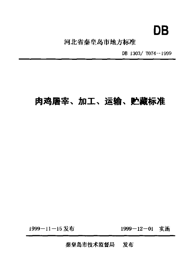 DB1303/T 074-1999 肉鸡屠宰、加工、运输、贮藏标准