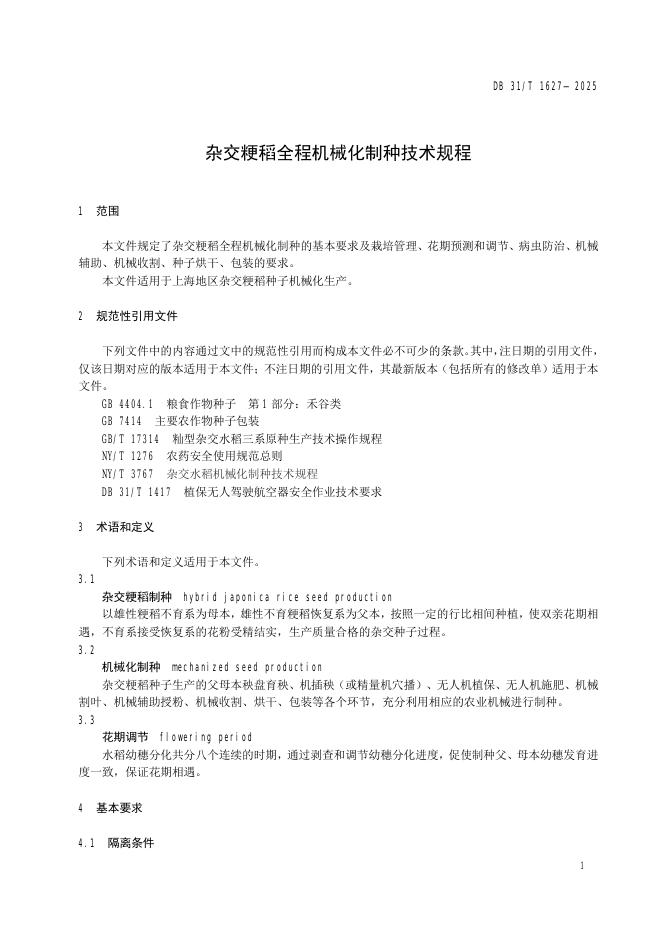 DB31/T 1627-2025 杂交粳稻全程机械化制种技术规程