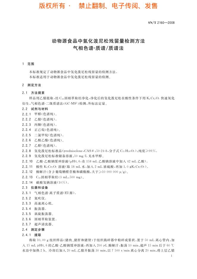 SN/T 2160-2008 动物源食品中氢化泼尼松残留量检测方法 气相色谱-质谱/质谱法