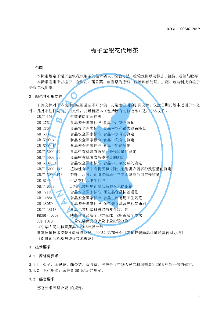 Q/XMLJ 0024S-2019 栀子金银花代用茶