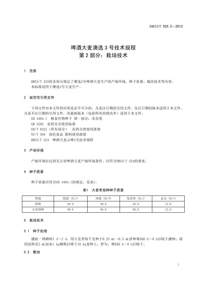 DB53/T 525.2-2013 啤酒大麦澳选3号技术规程 第2部分:栽培技术
