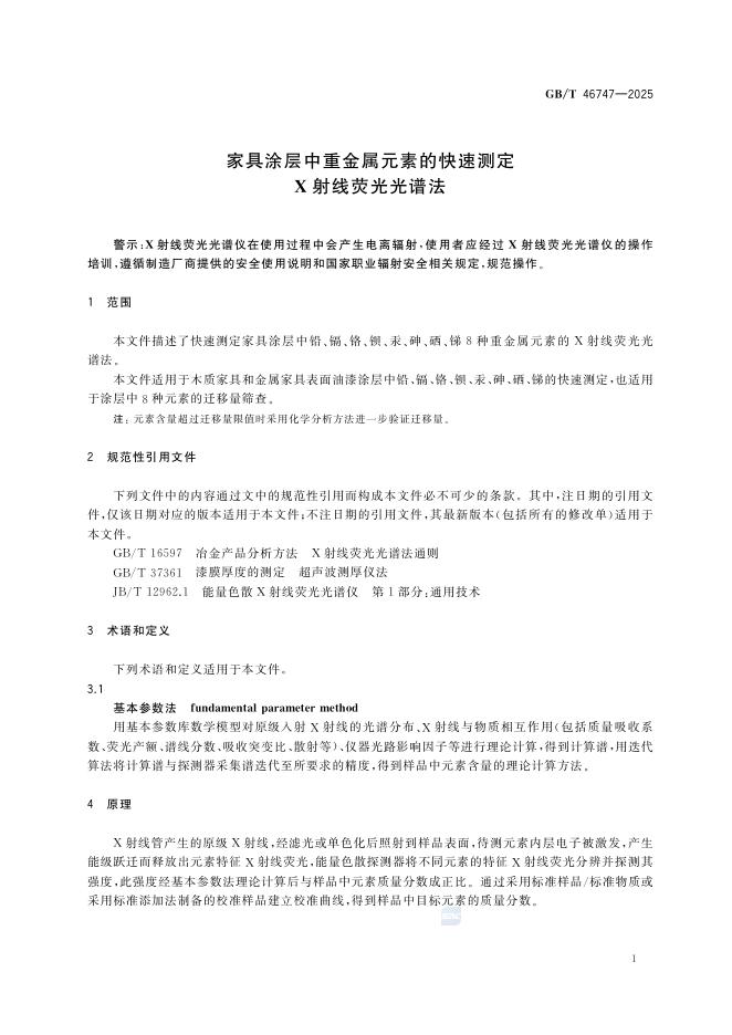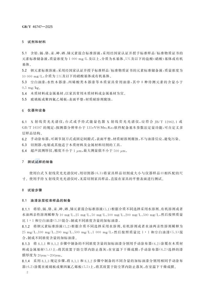 GB/T 46747-2025 家具涂层中重金属元素的快速测定 X射线荧光光谱法