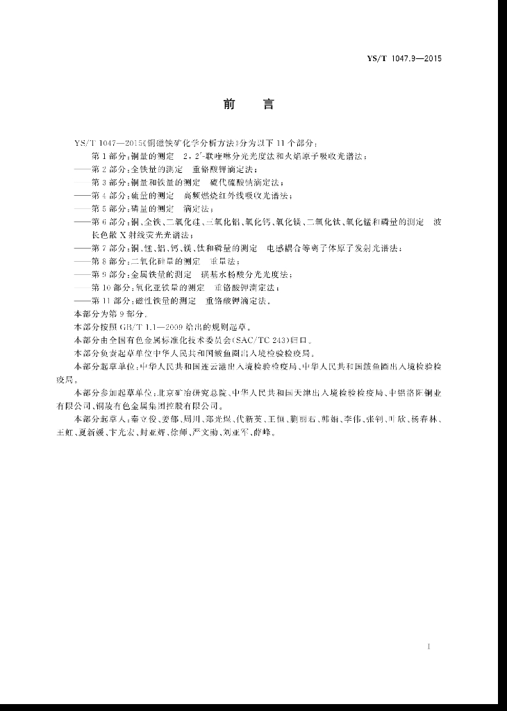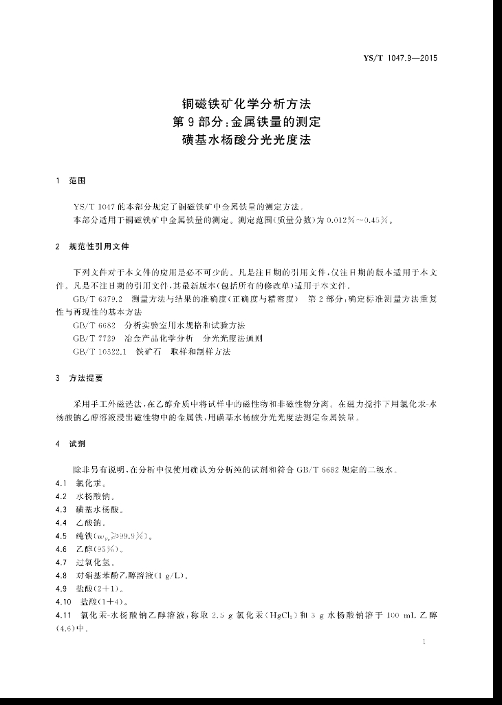 YS/T 1047.9-2015 铜磁铁矿化学分析方法 第9部分:金属铁量的测定 磺基水杨酸分光光度法