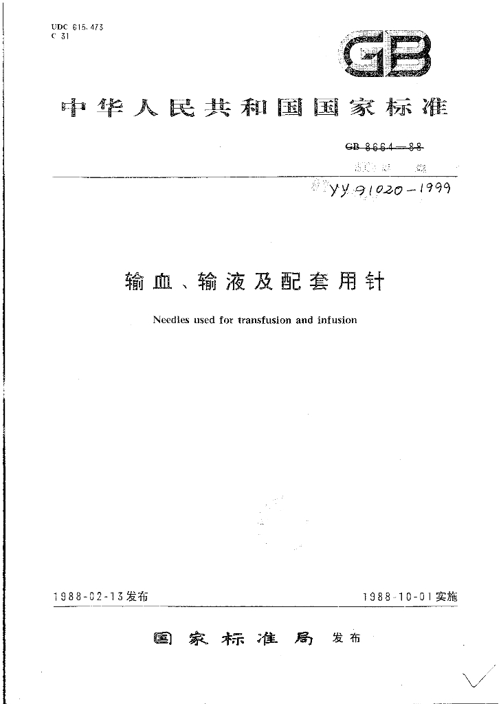 YY 91020-1999 输血输液及配套用针