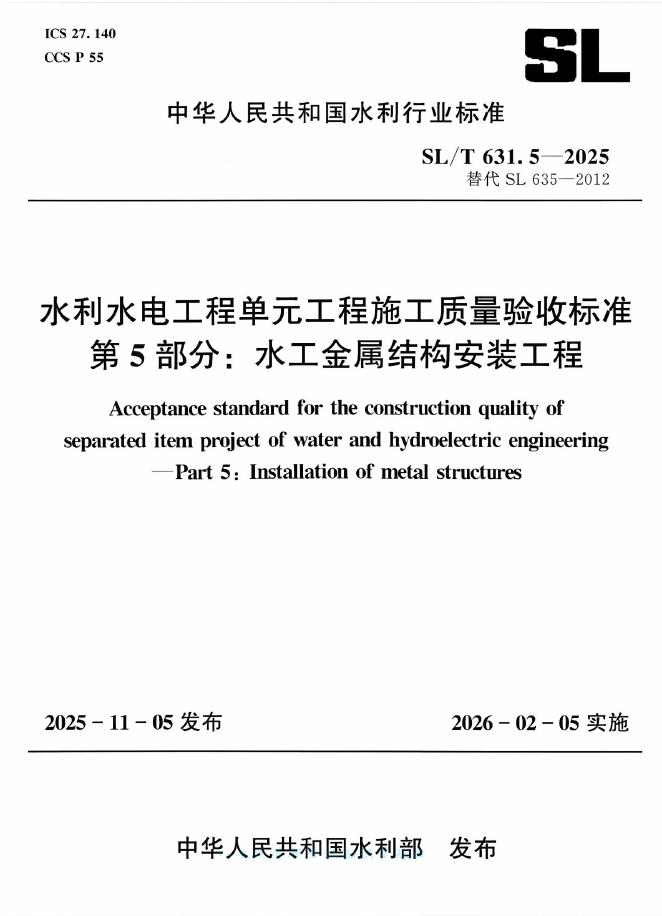 SL/T 631.5-2025 水利水电工程单元工程施工质量验收标准 第5部分:水工金属结构安装工程