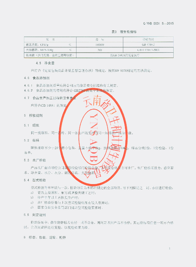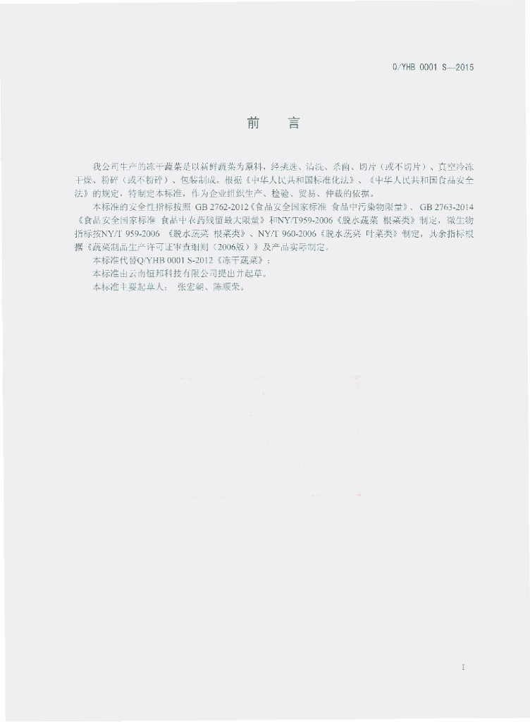 Q/YHB 0001S-2015 云南恒邦科技有限公司 冻干蔬菜