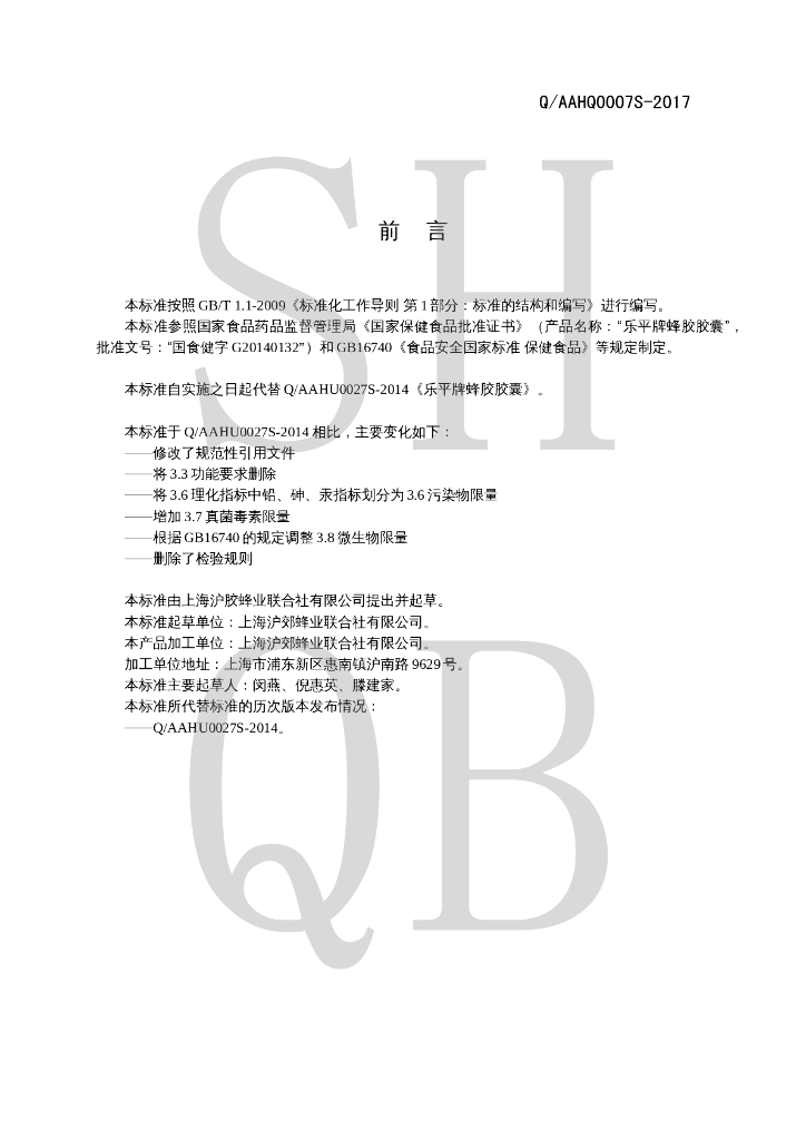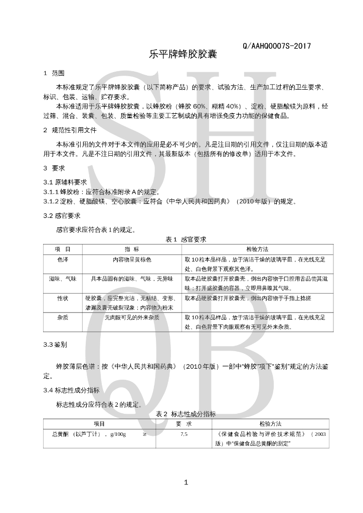 Q/AAHQ 0007S-2017 乐平牌蜂胶胶囊