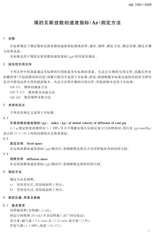 AQ/T 1080-2009 煤的瓦斯放散初速度指标(ΔP)测定方法