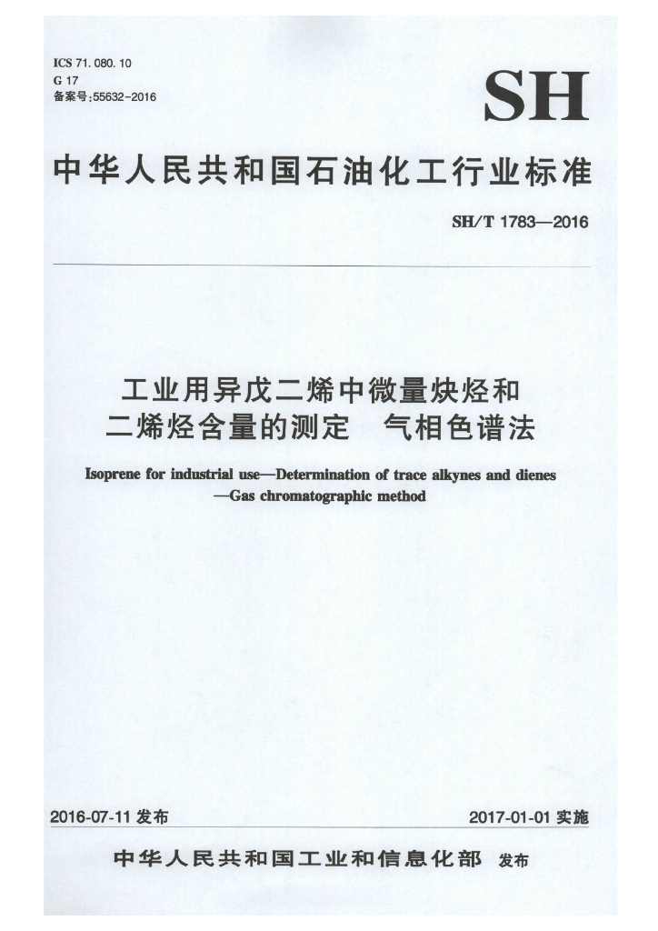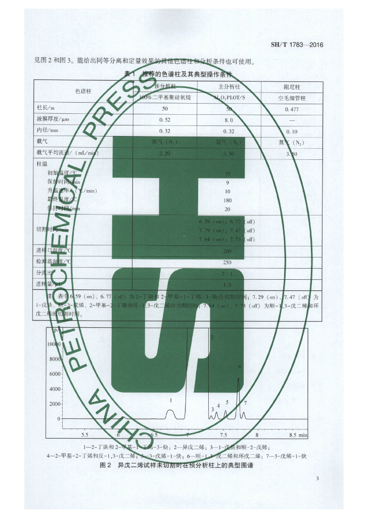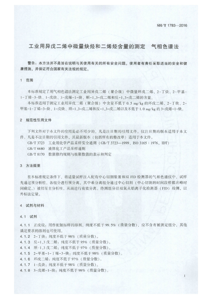 SH/T 1783-2016 工业用异戊二烯中微量炔烃和二烯烃含量的测定 气相色谱法