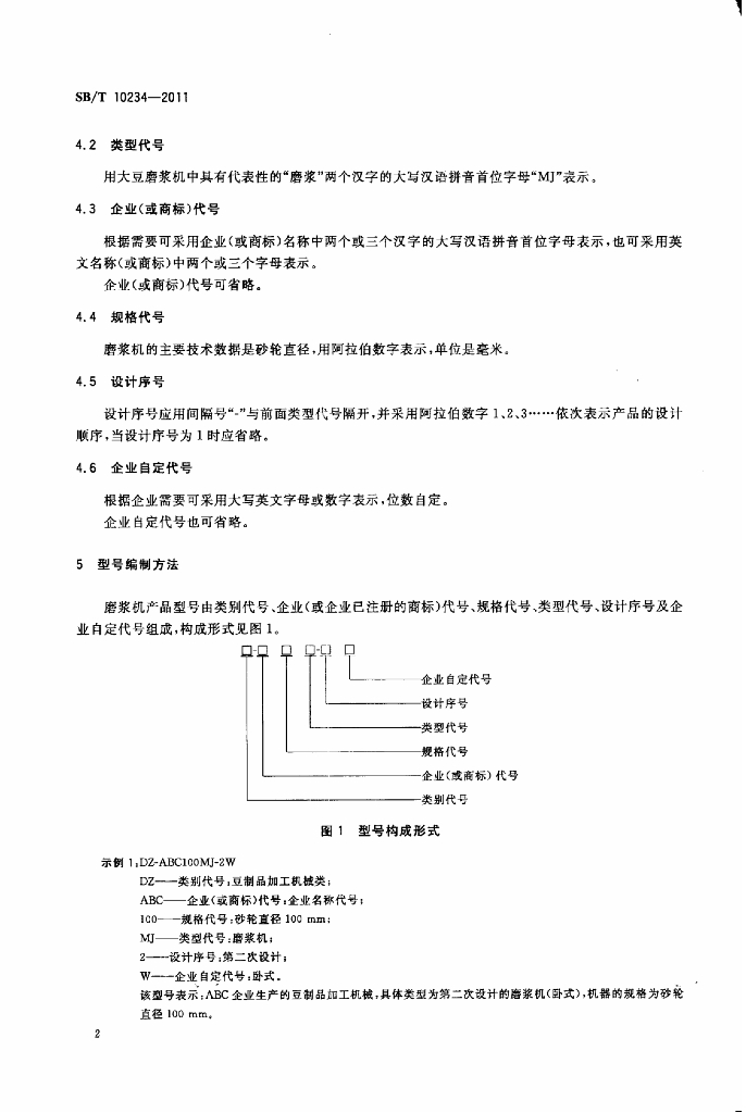 SB/T 10234-2011 大豆磨浆机产品型号编制方法