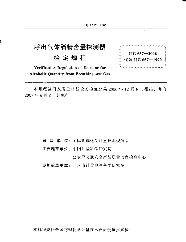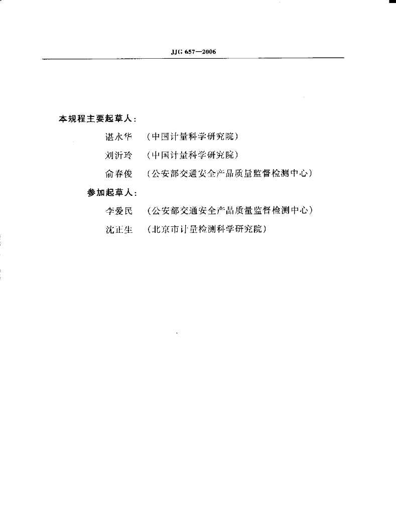 谌永华(中国计量科学研究院)、刘沂玲(中国计量科学研究院)、俞春俊(公安部交通安全产品质量监督检测中心)、李爱民(公安部交通安全产品质量监督检测中心)、沈正生(北京市计量检测科学研究院)