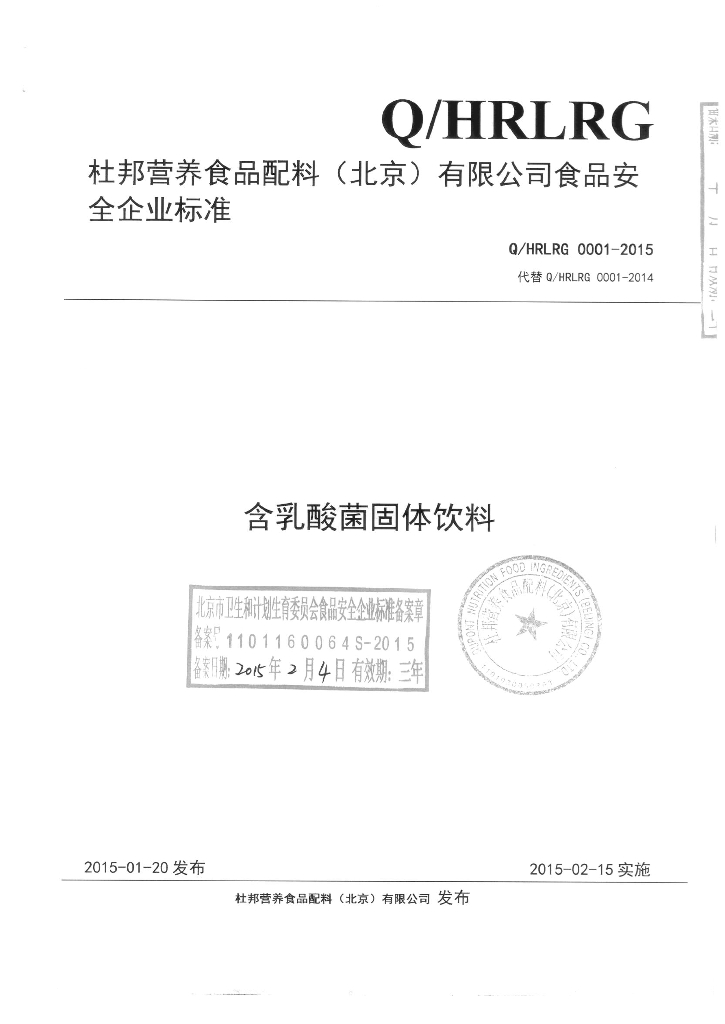 Q/HRLRG 0001-2015 杜邦营养食品配料(北京)有限公司 含乳酸菌固体饮料