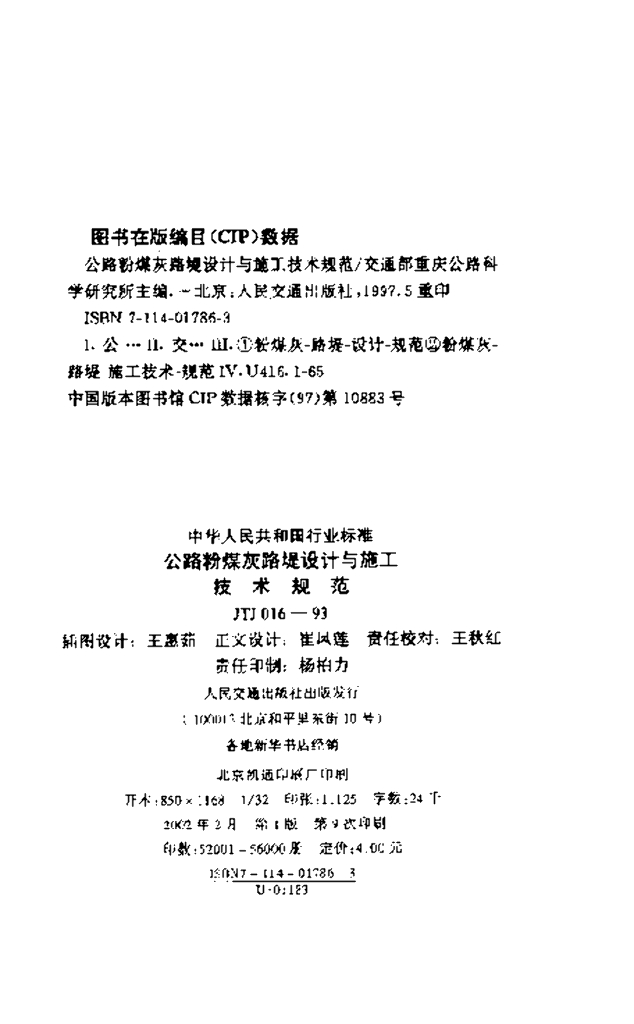 JTJ 016-1993 公路粉煤灰路堤设计与施工技术规范
