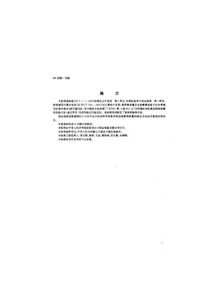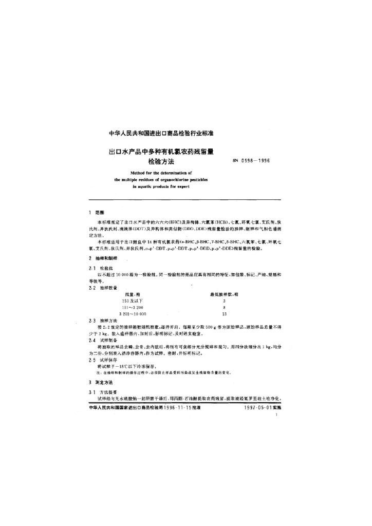 SN 0598-1996 出口水产品中多种有机氯农药残留量检验方法