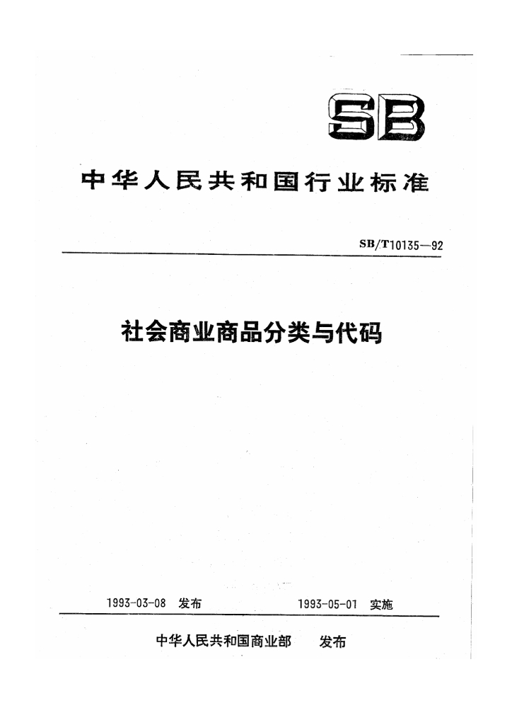 SB/T 10135-1992 社会商业商品分类与代码