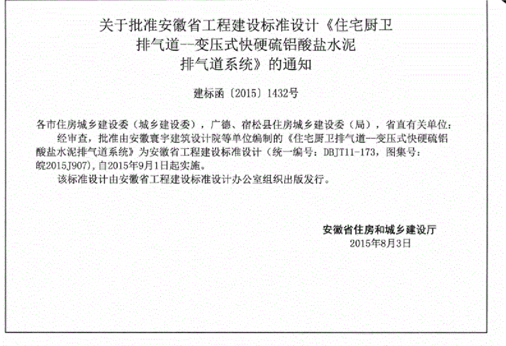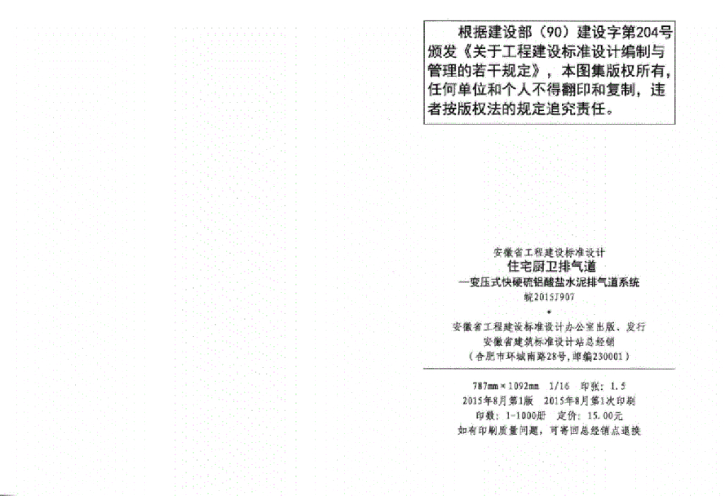 皖2015J907 住宅厨卫排气道-变压式快硬硫铝酸盐水泥排气道系统图集