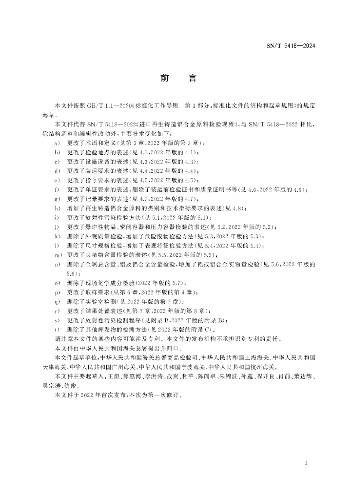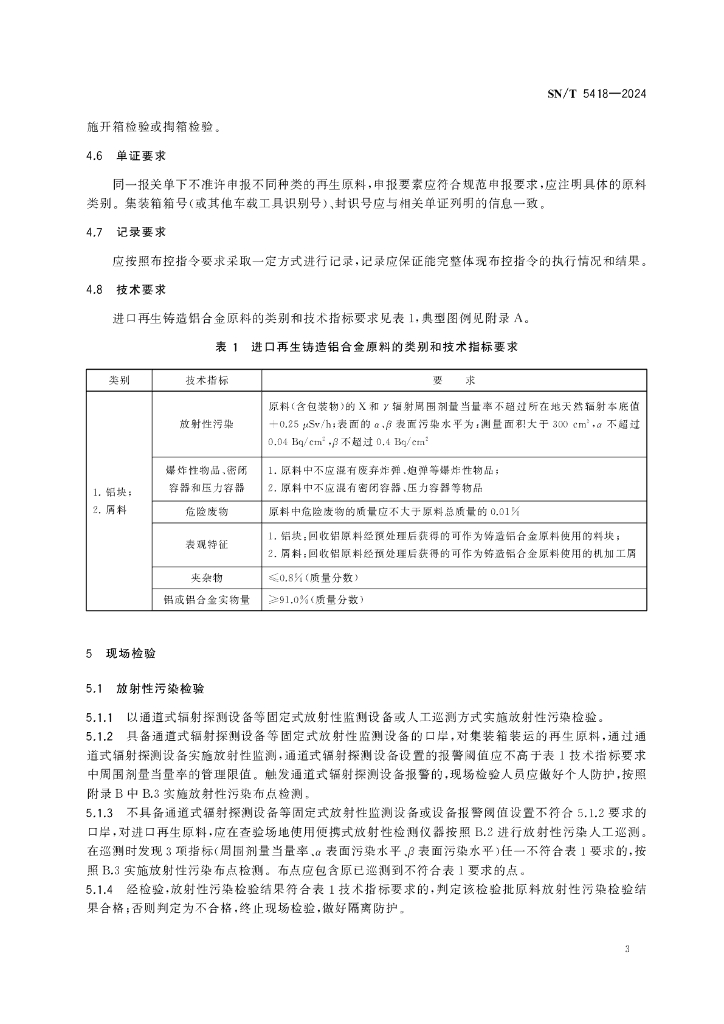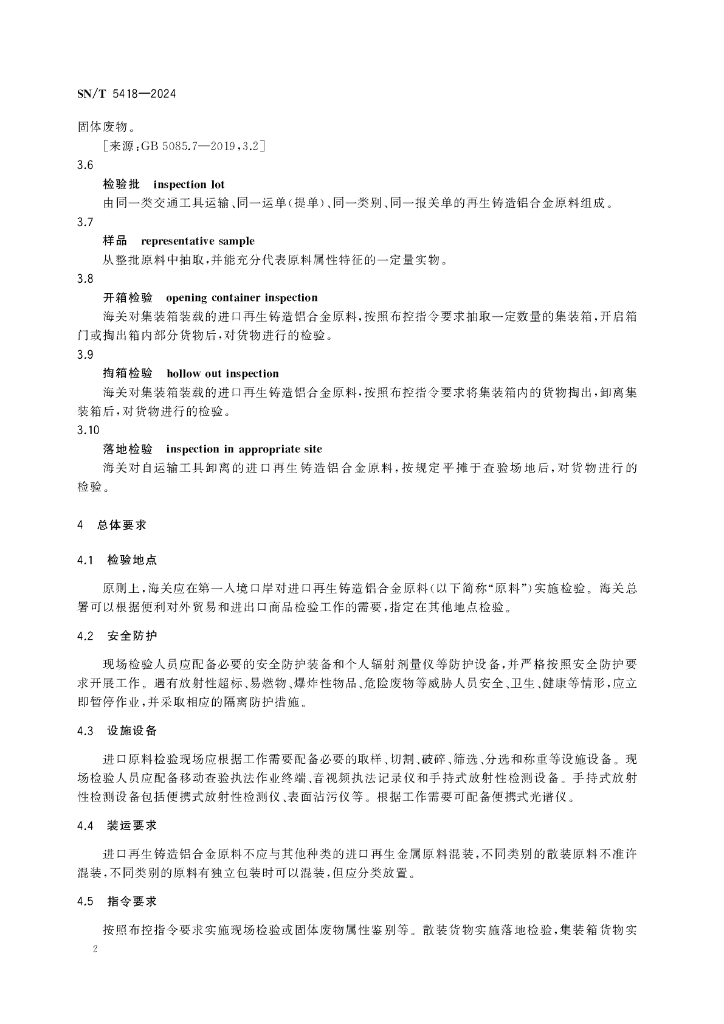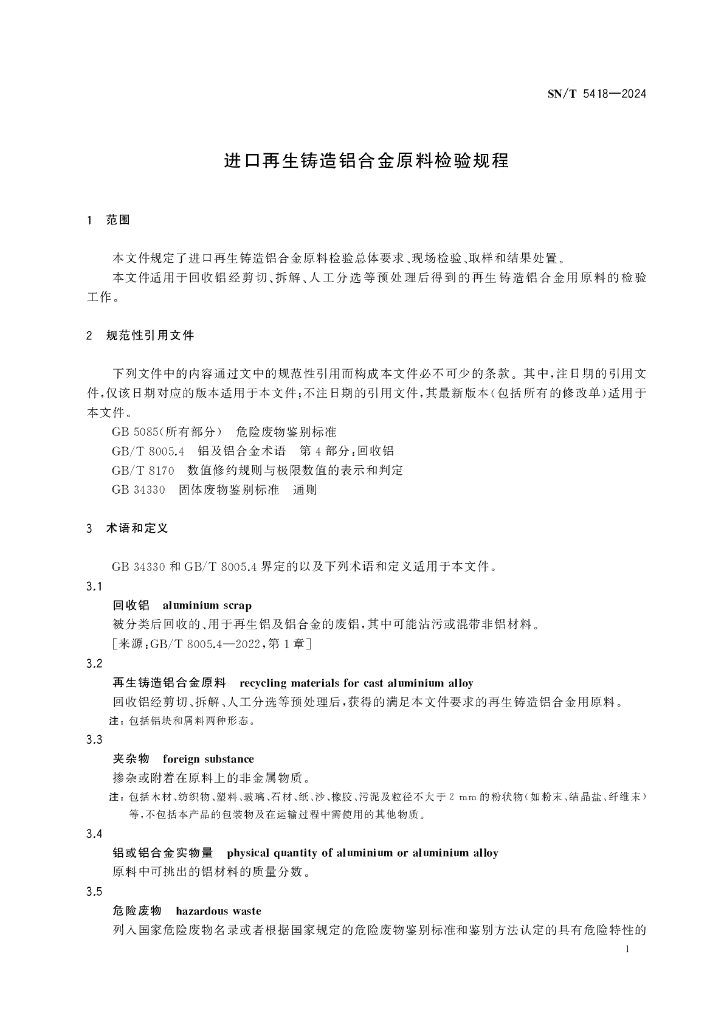 SN/T 5418-2024 进口再生铸造铝合金原料检验规程