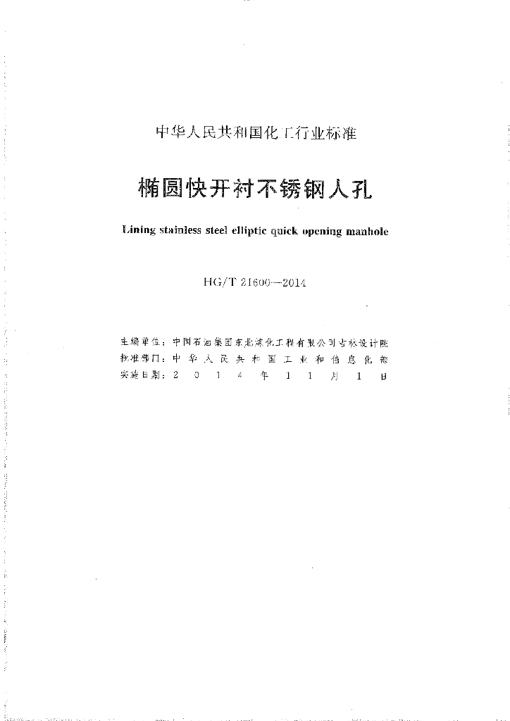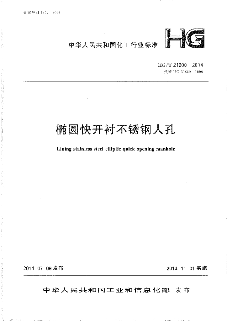 HG/T 21600-2014 代替 HG 21600-1999 椭圆快开衬不锈钢人孔