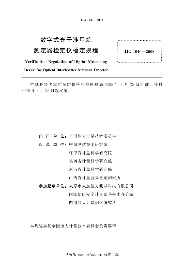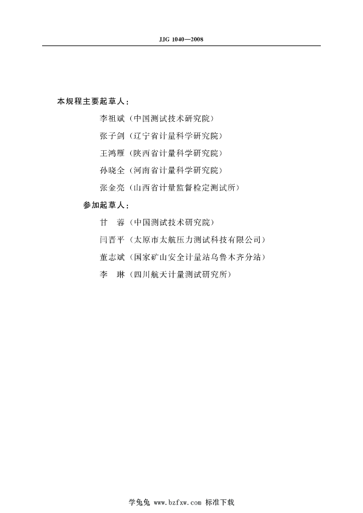 李祖斌(中国测试技术研究院)、张子剑(辽宁省计量科学研究院)、王鸿雁(陕西省计量科学研究院)、孙晓全(河南省计量科学研究院)、张金亮(山西省计量监督检定测试所)、甘蓉(中国测试技术研究院)、闫晋平(太原市太航压力测试科技有限公司)、董志斌(国家矿山安全计量站乌鲁木齐分站)、李琳(四川航天计量测试研究所)